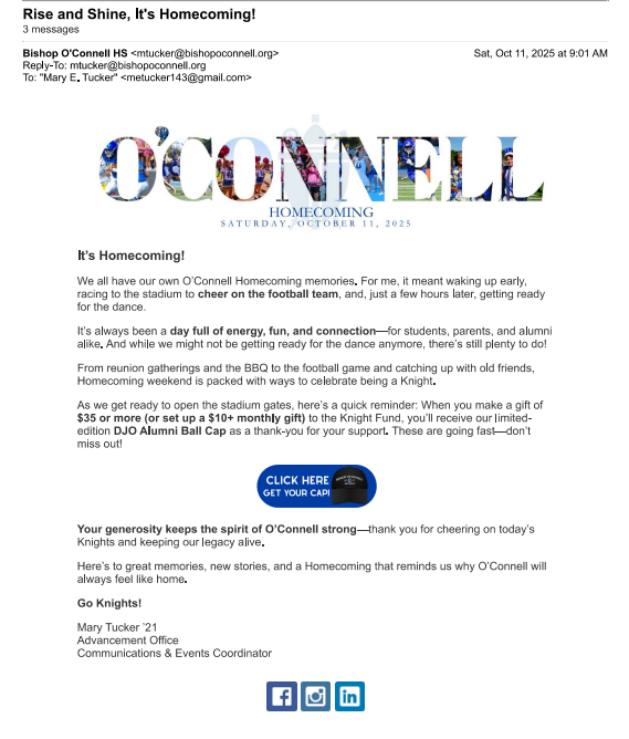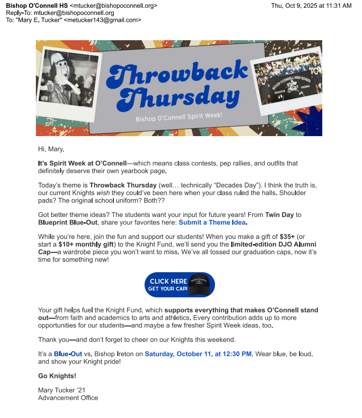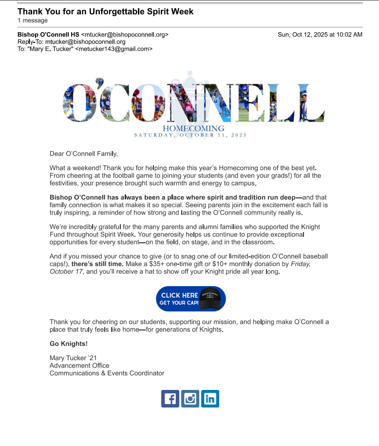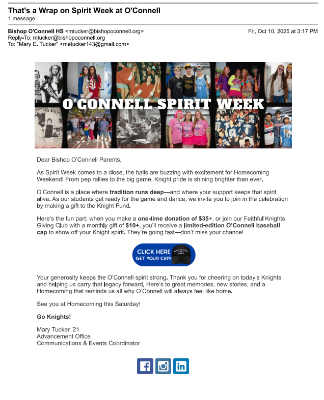 I design and write all major Spirit Week and Homecoming email communications — including theme-day announcements, fundraising appeals, reminder emails, and thank-you messages — ensuring a consistent, enthusiastic tone that reflects O’Connell’s culture of pride and tradition.